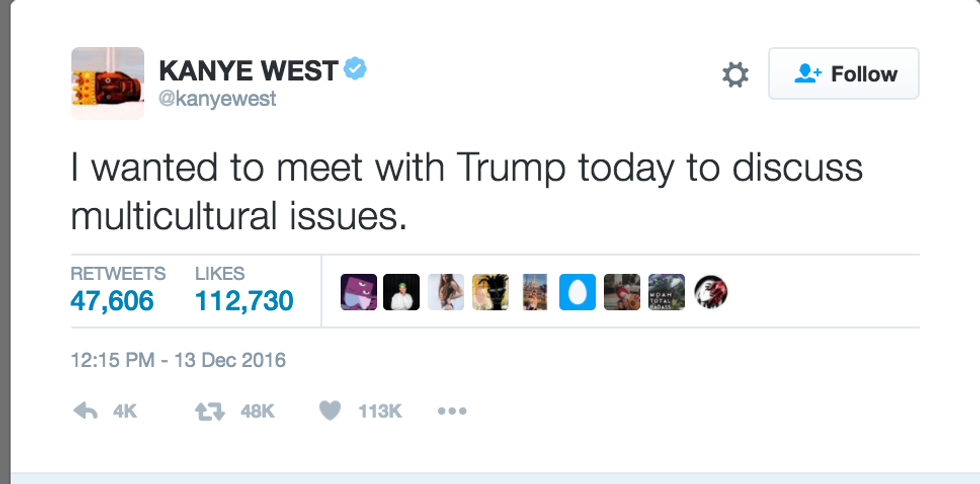 President-elect Donald Trump had an important meeting last Tuesday. No, he wasn't being briefed on intel or discussing his business conflicts or even thinking about the alleged Russian cyber attacks. He was meeting with Kanye West.