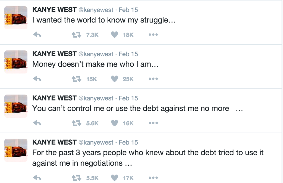 No, he didn't trade his Range Rover in for a rusted-out bike or move from Calabasas to Downtown LA, but the rapper-turned-fashion designer did announce that he is $53 million in debt via his Twitter this past Monday, Feb. 15.