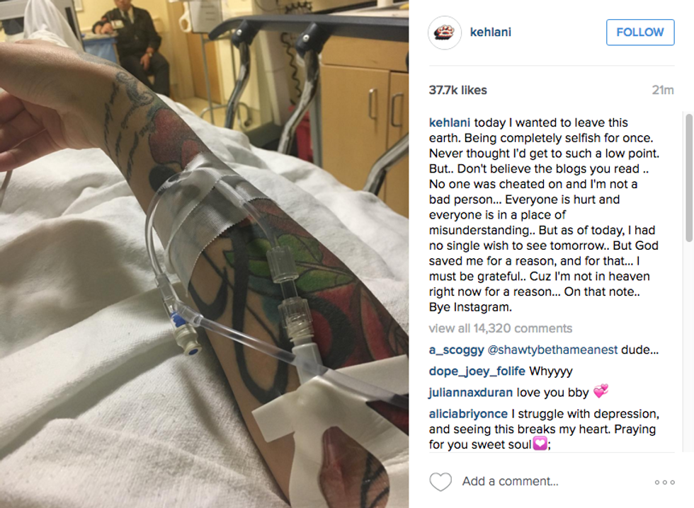 We all thought the story would end here, but Kehlani’s next Instagram post would take the situation to the next level. This is because she posted a picture of her in the hospital recovering from what she claimed to be a suicide attempt. She stated in her post that she did not cheat on Kyrie, despite the rumors, and that everyone was misinformed. She believed that these rumors were making her out to be a bad person and because she was struggling so bad with the actual situation, she “had no single wish to see tomorrow."
