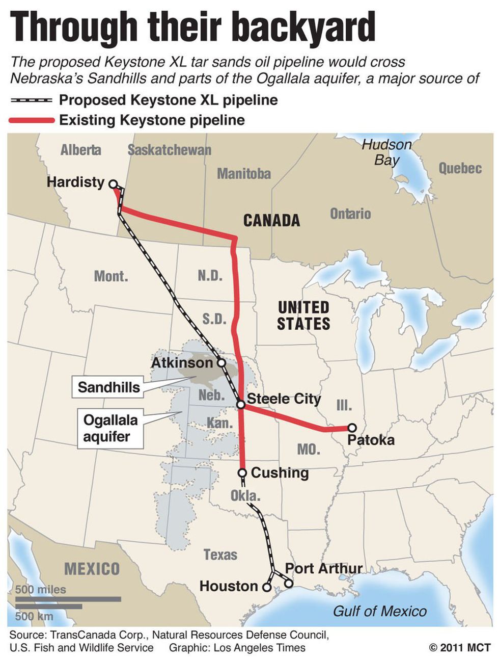 The Ogallala Aquifer provides water to millions of people and plants throughout the central region of the United States, and it holds enough water to cover the country’s 48 contiguous states two feet deep. As for the Keystone pipeline, TransCanda, head of this project, proposed this oil pipeline that would transport bitumen and liquefied natural gas drawn from the tar sands to refineries on the Gulf Coast, mainly in Texas. So, it would be a sort of transcontinental oil pipeline from Canada to Texas.