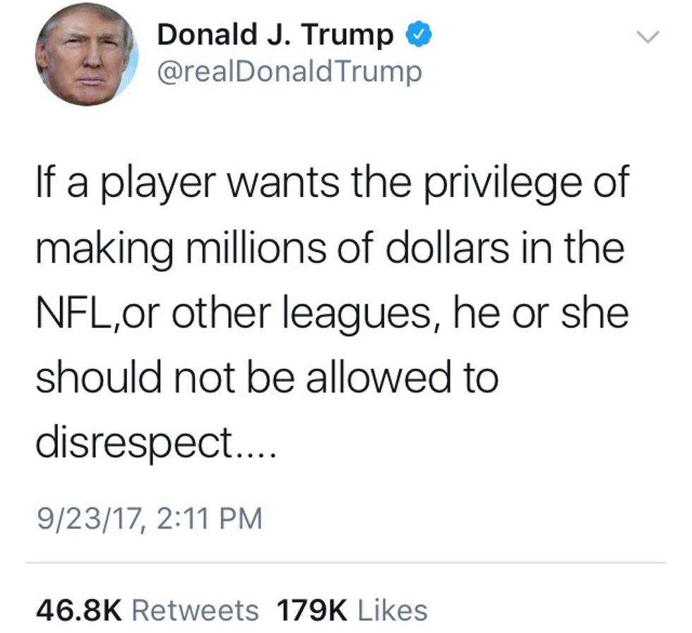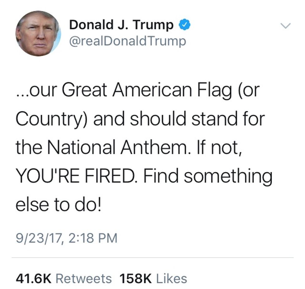 On September 22, Donald Trump verbally attacked NFL players who knelt during the national anthem, referring to them as "sons of b*****s."