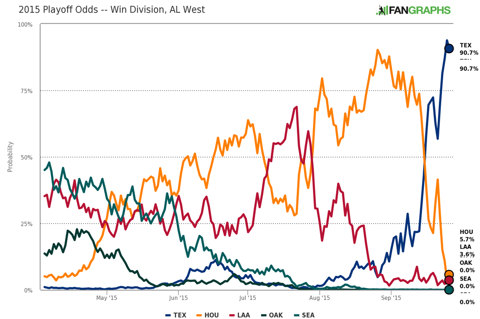 Fast forward exactly one month from then to Saturday, September 26th. Their record now sits at 84-70, they lead their division by three and half games, and their chance of winning their division according to FanGraphs is 90.7%.