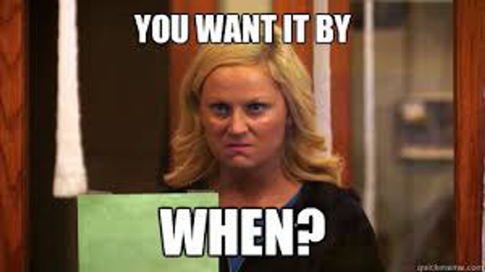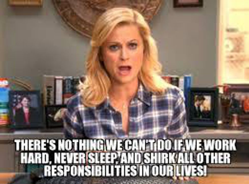When we hit the half-way point in the semester, it does not feel as though the journey through the loads of homework, papers, and presentations is almost over; it begins to feel as though the semester is never going to end. Why? you may wonder. Well, in ohio, half-way through fall semester signifies the end to any hopes of warm weather (except those two random days where it's 75 degrees and sunny...), the rains seems continuous, and it's the beginning of flu season--let the perpetual sinus infections begin! In addition to the tempermental weather and shared germs, the workload seems to double in the middle of the semester: more exams, more projects, overall more is expected from students. We, as a collective student body, begin to feel the pangs of final grades closing in on us. Have no fear, though, because Leslie Knope is here to give us motivation to make it through these last four/five weeks.