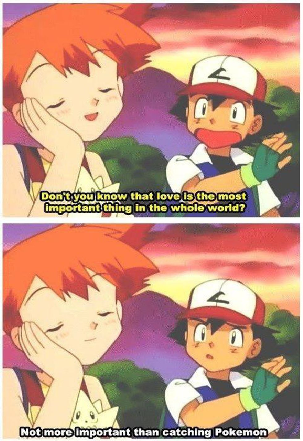 Ash wants to be the world's greatest Pokemon Master. It's his dream and that's all that's important to him, there's nothing more important to him than Pokemon, not even love.
