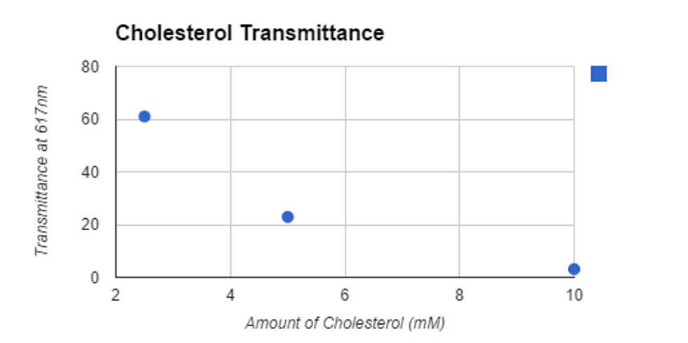 About 8.5mM cholesterol concentration in the lipid extract— this was found by using the transmittance of the egg yolk extract and finding where on the line of best fit its complimentary y-value would fall; this gives an accurate approximation of the level of cholesterol in the egg yolk.