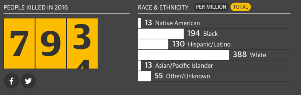 Last year, the total number of deaths of civilians at the hands of law enforcement was over 1,000. Just in the past 9 months making up this year, 793 civilians were shot and killed by police officers, according to The Guardian. That is a staggering number. Depending on where you actually get the statistics, though, that number can be as high as the report from Killed By Police, at 844 for the year. The end results for last year are the same, with The Guardian’s database of police killings giving a grand total for the year of 1,134 and Killed By Police a striking 1,199.