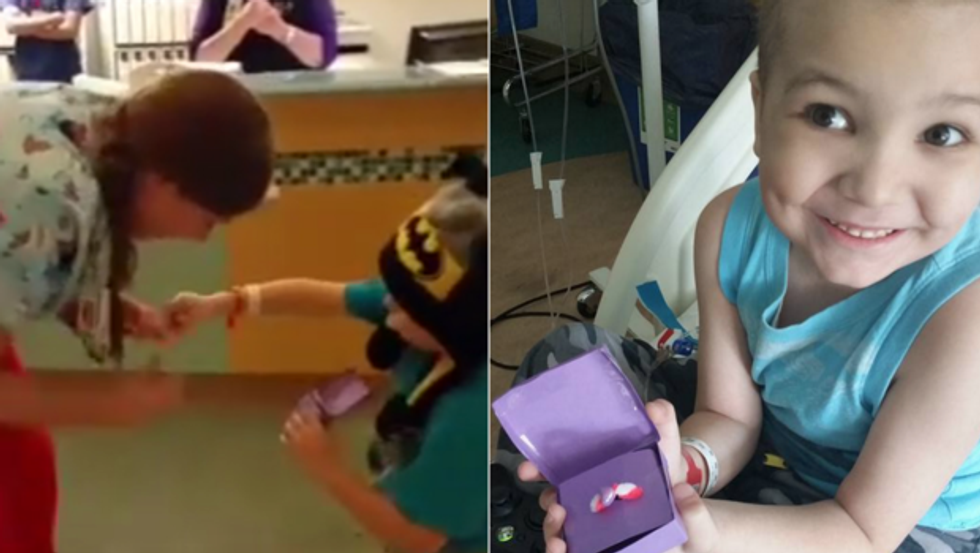 This 5-year-old boy with leukemia proposed to his nurse. Sarah Richardson is one lucky gal. When she joked with little Gideon that she wishes her boyfriend would propose, he stepped up and made a ring and popped the question! Around 30 people came out to watch him propose to Sarah while the music therapist played music in the background. Sarah happily said yes! It's stories like these that make me cry for no reason.