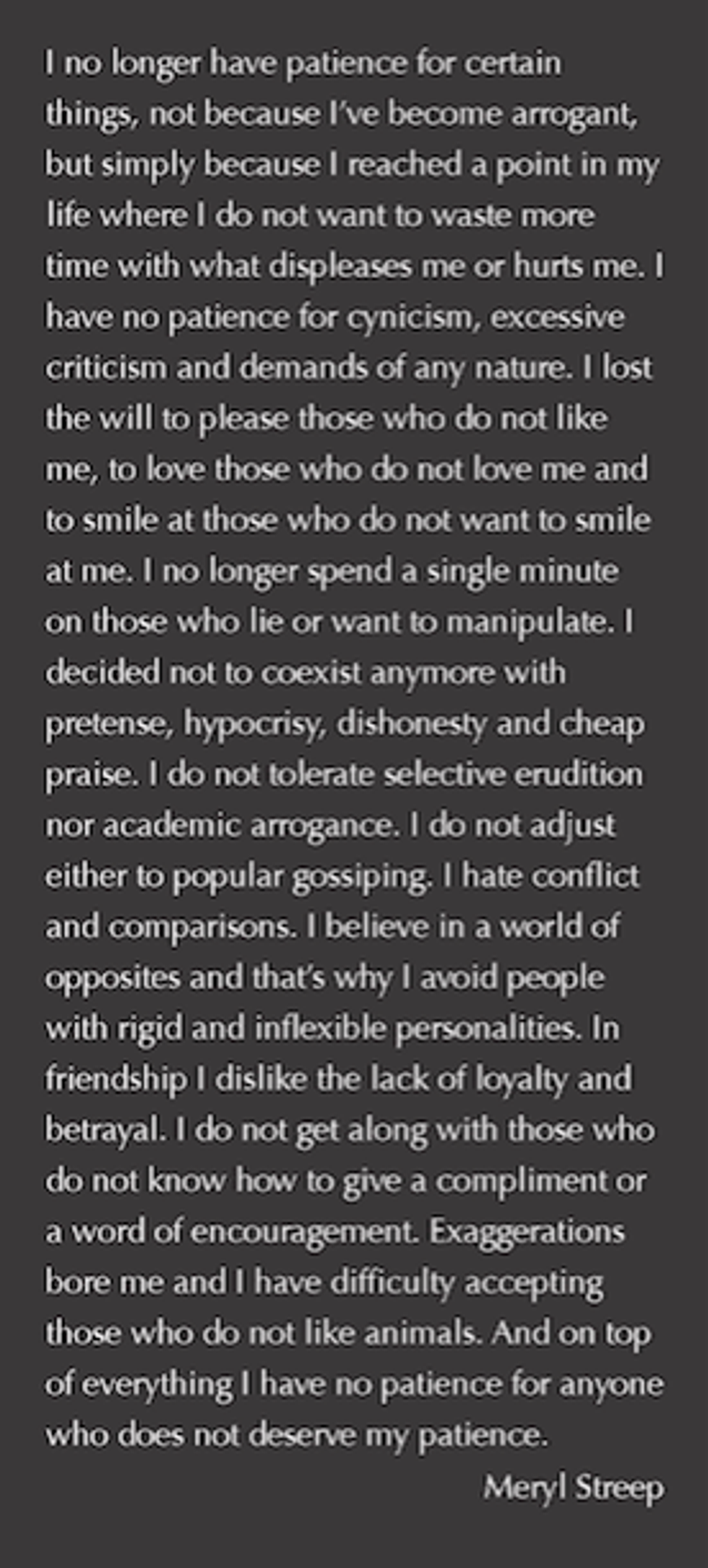 Even though she has won numerous awards, they do not represent who she is as a person. Meryl is everything a role model for women across the world should be. She stands for what she believes in, rejects what she doesn't, she isn't afraid to stand for what is right or raise her voice, and has created new paths for women throughout her career. This is why we should love Meryl Streep.