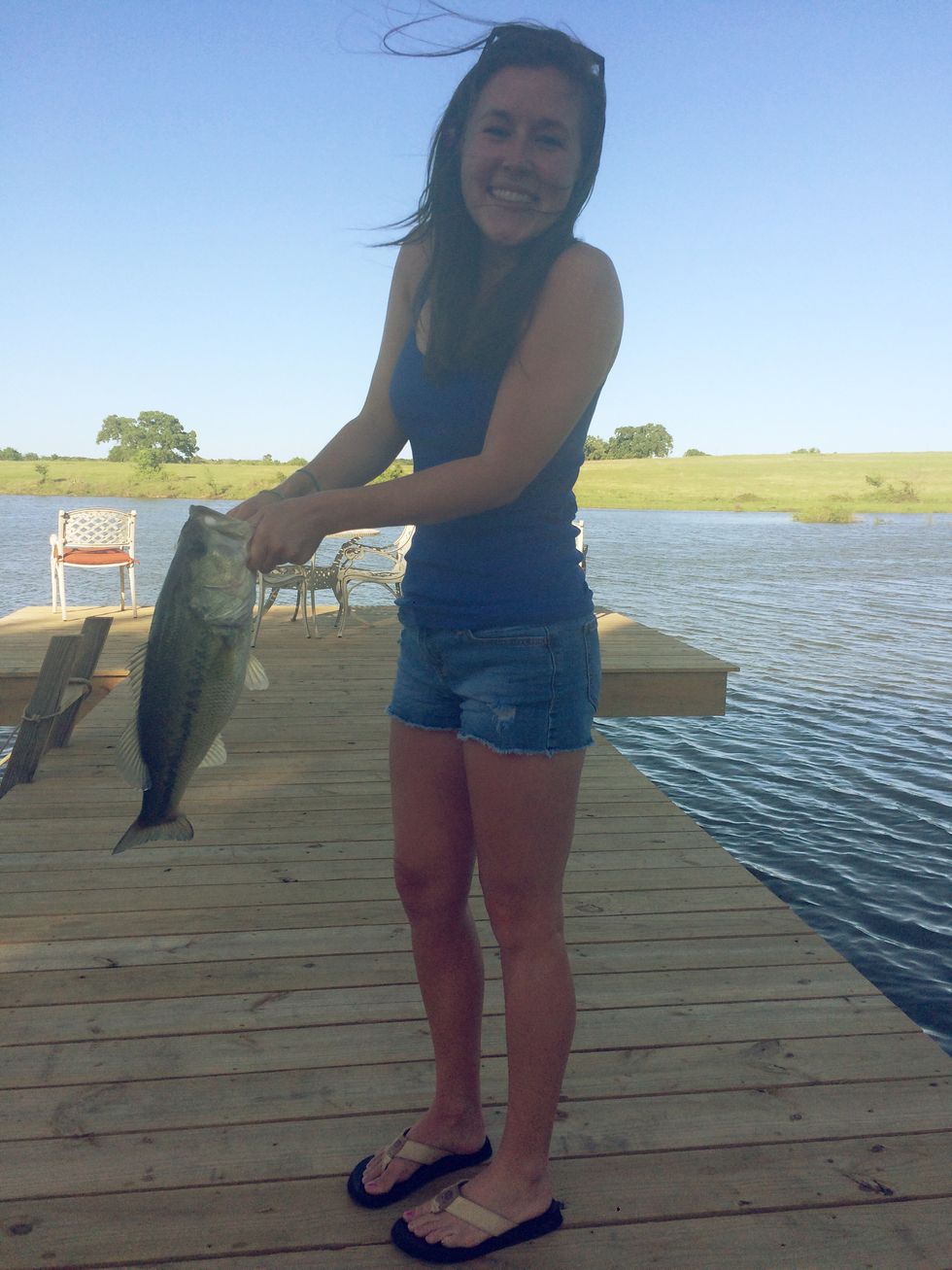 After I unpacked, Colton's girlfriend Faith and I promptly threw on our swimsuits and ran to the pool. The day was easy, breezy, and beautiful. The pool was perfect, and the conversations were great, but my favorite part was fishing later that day. We walked down to the lake, grabbed two poles (I chose the pink one, of course), and cast out. On that first cast, I reeled in a seven, eight, or nine-pound bass. At this point, you're probably thinking—wow, this girl has no idea what she is talking about. But to the contrary, I know that every good fish tale is exaggerated, so I purposefully wanted to leave a little to your imagination. But for the record, we'll just say it was a 10-pound bass (insert wink here).