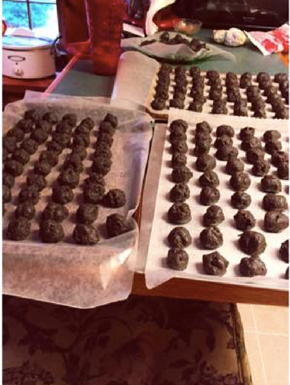 After that, take a little bit of the mixture at a time -- and I mean a little bit. Just about a teaspoon full, roll it into a ball, and place it on a baking sheet. You want to keep these small -- they are so rich that a large one can be too much! (I made that mistake the first time I made them).
