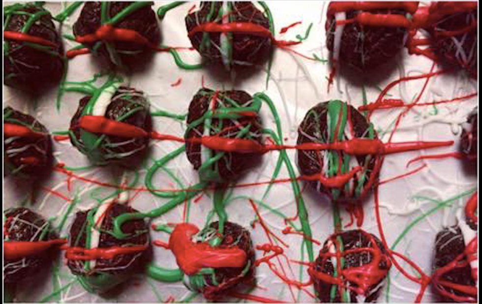 While the Oreo Balls are in the fridge, take the opportunity at the end of the hour to melt your semi-sweet baking chocolate. I like to use red, green, and white for Christmas, but it’s your own personal preference. Or you can just eat them as is! They are still delicious.