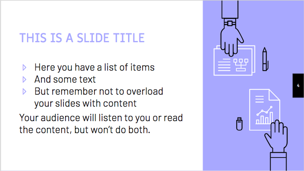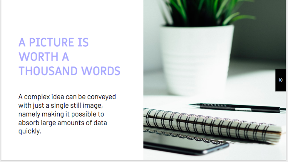 This can be done in multiple ways, such as offsetting chunks of text, using bullet points, or adding images or graphics. If your slide consists of only a continuous chunk of text, your audience will become overwhelmed and won't bother to read it. Remember, your slideshow is a visual aid to your presentation and should be appealing to look at.