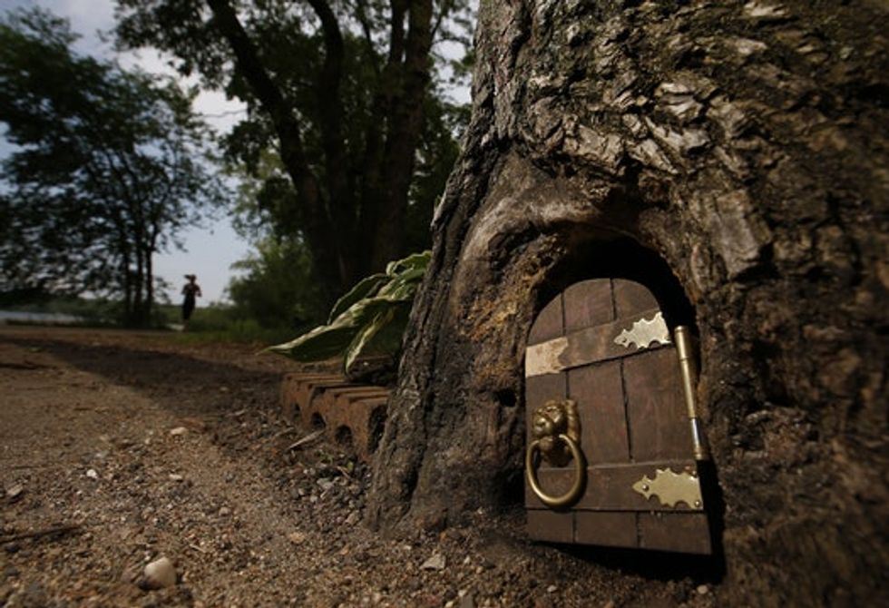 A cute little elf lives behind a tiny wooden door in a tall Ash tree along the path of Lake Harriet in Minneapolis, Minnesota. You can write him a note, and he'll write back!