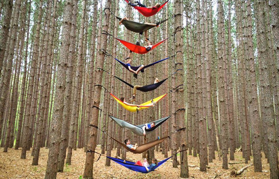 You’re literally hanging out with (between) trees. I don’t know how to make this any clearer. Climbing trees also works here.