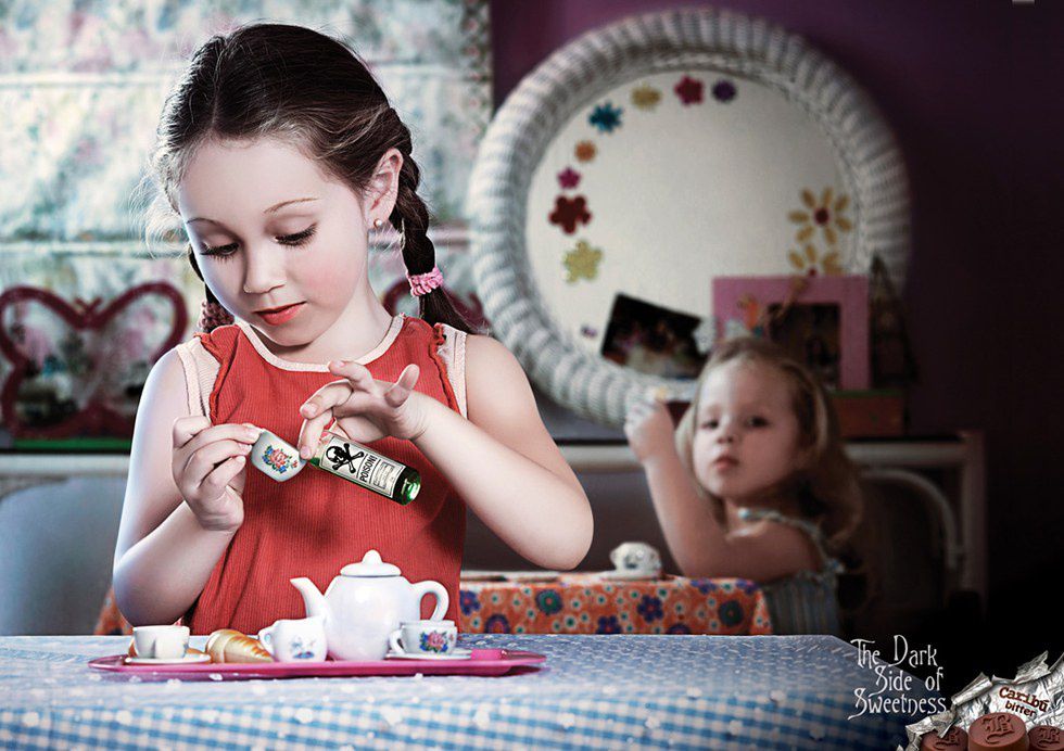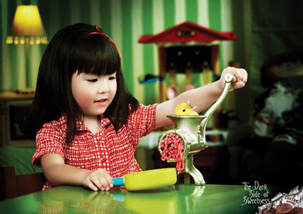 Everyone loves food. Selling food really isn't that hard, especially when the food is chocolate. Just make it look yummy and you have literally done everything you need to do as a Ad agency. So what in the world is this? Please, someone explain, was this come up with and run through a mental institution or perhaps a jail? Is the target market those creepy dudes on Craigslist trying to buy children or sell weird blood stained couches? Where exactly did you feel it was necessary, Caribu, to show pictures of adorable kids grinding up live baby ducks or poisoning their siblings at tea parties? No, we get the pun, the dark side of sweetness and the kids are adorable and sweet and doing really disturbing, dark things, we get it, that's not really the problem here. The problem is that this is a terrible idea and I can guarantee sold zero chocolate bars, so you failed on all counts, which worries me because Caribu should at least have enough profit to pay for these poor children's therapy once they get old enough to realize what they posed in.