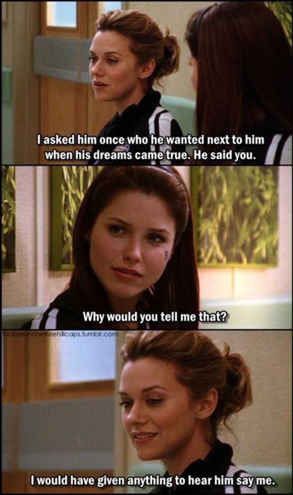 "My best friend –OK this one is so important; choose wisely, I got really lucky with mine. My best friend is funny, intelligent, creative, beautiful, and successful, and very kind. She’s also impulsive, frustrating, um complicated, childish, but I would not have her any other way. And the best part about Brooke Davis is that she always puts friends first. So if you are ever in any kind of trouble, you know who to call. I can’t think of anyone I’d rather have watching over you." Here's the full quote because it was too long to fit in a gif, but too important not to share. They really appreciate each other; both the good and bad qualities.