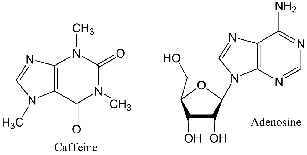 However, a compelling originator for sleep is believed to be adenosine, which builds up in our brains as a byproduct from the use of adenosine triphosphate (ATP, a main energy storage molecule) by our neurons and other other brain cells. As adeonsine builds up in our brains we get drowsy, and surprisingly enough, caffeine has a very similar molecular structure to adenosine (notice the same double ring structures of the molecules in the figure below). So, when caffeine is consumed it binds to the same brain receptors that adenosine would bind and in doing so it tricks our bodies into thinking they're not tired. As caffeine is filtered out of our bodies, adenosine lingers in the shadows in wait to flood the receptors previously occupied by caffeine, inevitably making us tired again. Thankfully, when we sleep, those adenosine molecules gradually get absorbed by our neurons helping us feel refreshed by the time we wake up.