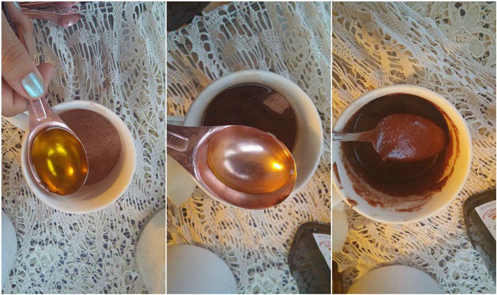 Two: Mix together the dry ingredients: cocoa powder, flour and sugar.