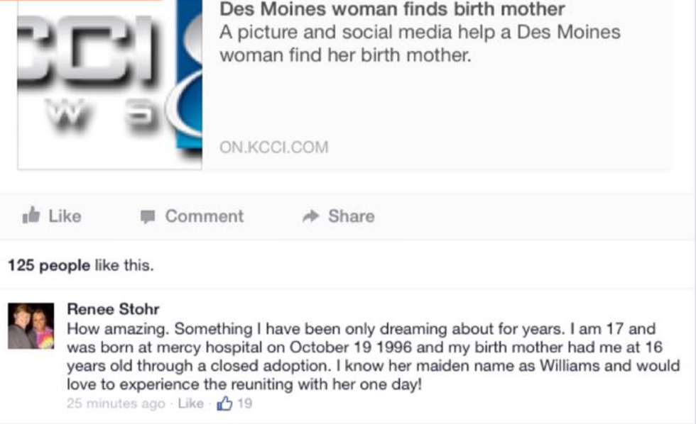 A friend of both sides of my unfound (at the time) family had recognized the facts I had listed in my comments, and proceeded to my profile, only to confirm I had to be the daughter of the friends she had known had given up for adoption in high school. Goosebumps fact: She screen shotted my comment and forwarded it on to my stepmom (who I did not know about at the time) at 11:11 p.m. Make a wish.. oh wait, my wish is about to be granted.
