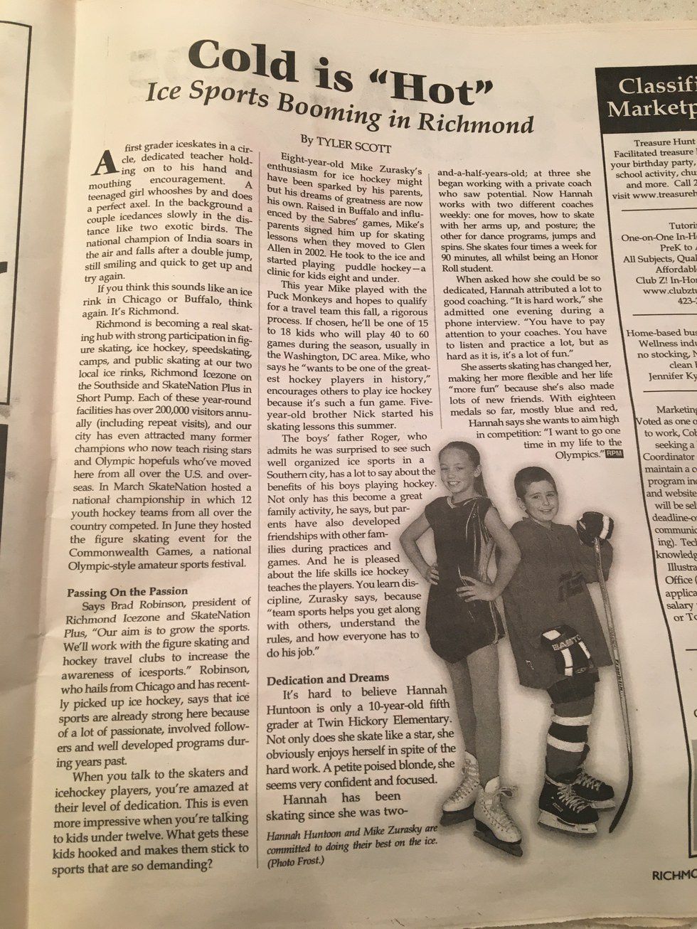 By some random act of God, my mom found an article written about me in the July 2005 edition of Richmond Parents Monthly, detailing the growing footprint that ice sports such as hockey had made in the greater Richmond area.