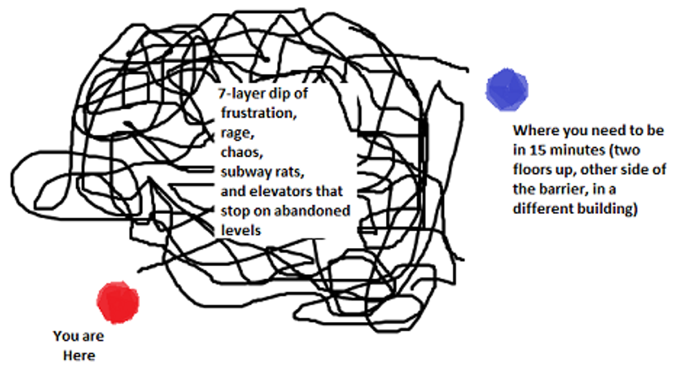 This is about the point we realized we might have made a mistake. The first indication was the absolute hot mess that is the New York City bus station. We took a bus from my hometown into the city, and from there we were supposed to switch to another, which we would be on for the whole night until we reached the far side of Pennsylvania. The problem was that the bus station, which happens to be in the lowest, dirtiest, and overall sketchiest sections of Grand Central, is, as mentioned above, a hot freaking mess. Here is a rough diagram of this station’s setup: