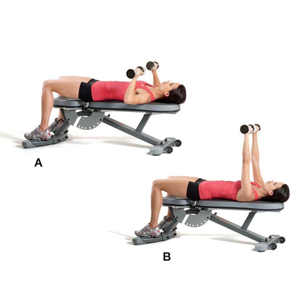 Chest press: 2 sets x 12-15 reps. Grab the nearest dumbbells and lay flat on a bench (make adjustments to the bench as needed). Keep your shoulders tight as you lift the weights straight up in the air from your chest.