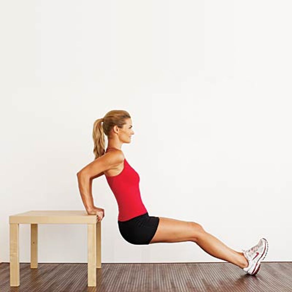 Bench dips: 2 sets x 10-15 reps. Find a bench that no one is using (this bench does not have to be particularly for exercise use). Put your hands behind you and bend your elbows until your body is at about a 90 degree angle. Slowly push yourself back up. You should feel the burning sensation in your triceps (it will hurt; this is a tiny muscle, but keep going!).