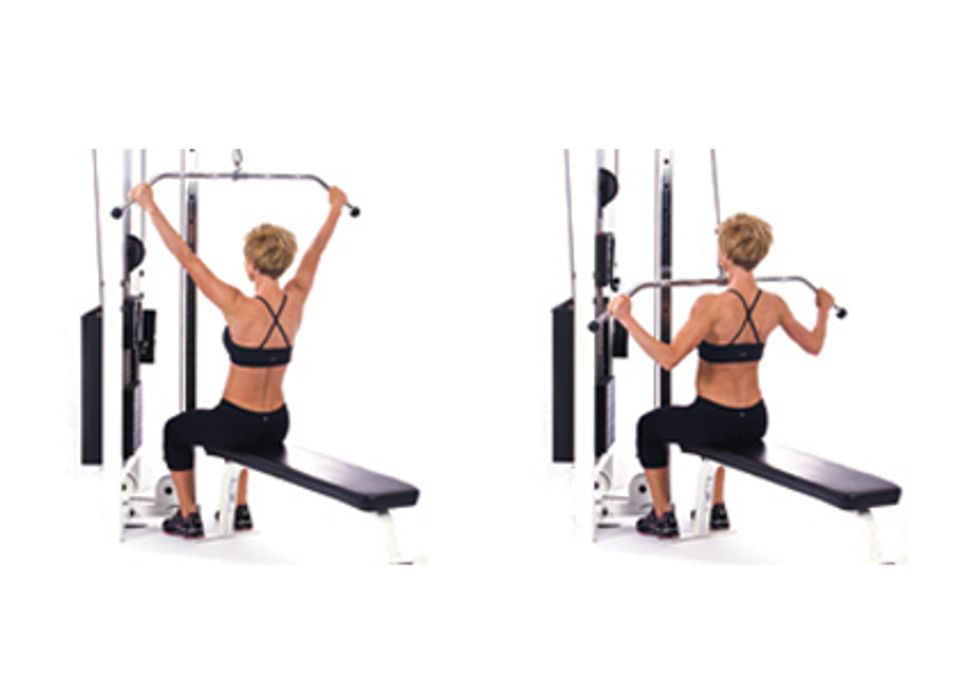 Lat pull down: 2 sets x 10-15 reps. Find the lateral pull down machine at the gym. Sit down on the seat and adjust the thigh pads so that your thighs sit right under the support. Grasp the bar up top with a wide grip. Keep your shoulder blades tucked toward your body and pull the bar down towards your chest. Squeeze your shoulders as you do this!
