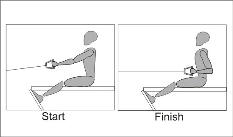 Seated row: 2 sets x 10-15 reps. Find the seated row machine at the gym. Sit down on the seat and keep your back straight. Grab the handles (make sure your arms are completely straight) and pull towards your chest, pinching your shoulder blades together.