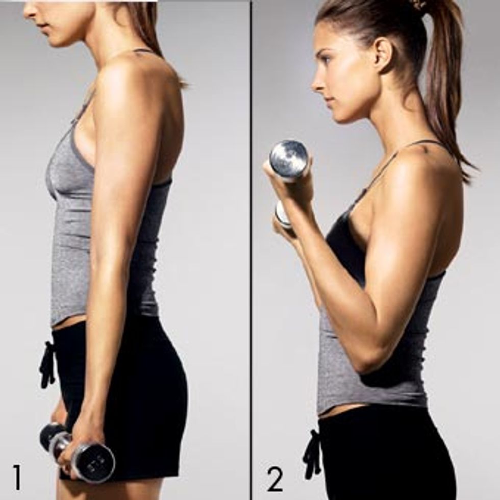 Bicep curl: 2 sets x 10-15 reps. This is as basic as you can get! Grab two dumbbells. Keep your elbows tucked by your side and curl the weight up. Hold and release, keeping your elbows where they are!