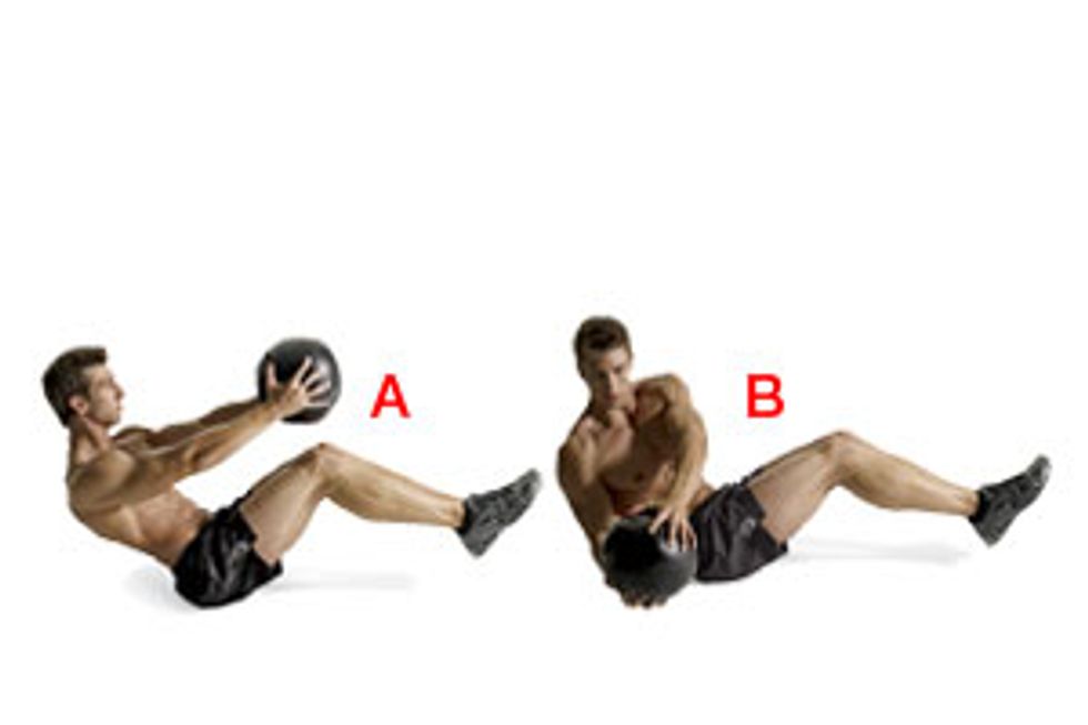 Medicine ball twist: 1 minute. Grab a medicine ball (not too, too heavy) and sit down on a mat at the gym. Left up your legs so that they are just slightly off the ground- around 4 inches. Twist and touch the ball to the ground, while your abs remain extremely tight. Keep twisting side to side at a medium pace.
