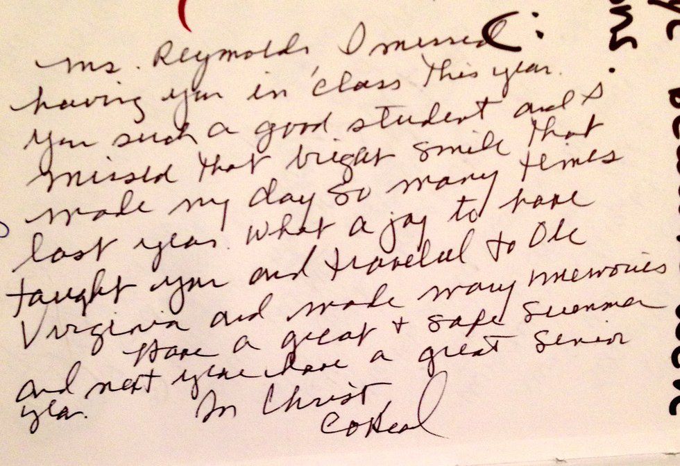 You taught me about God. You told students that they could go anywhere they wanted to in life as long as they kept the Lord in their heart and by their side. You taught students to love God and to remember that at the end of the day, “good grades won’t get you into Heaven.” That’s not to say you didn’t want us to try to do our best when it came to tests and quizzes, because you did, but at the end of the day, I’ve come to realize that He doesn’t care whether or not the grades are good, but rather that your heart and soul are.