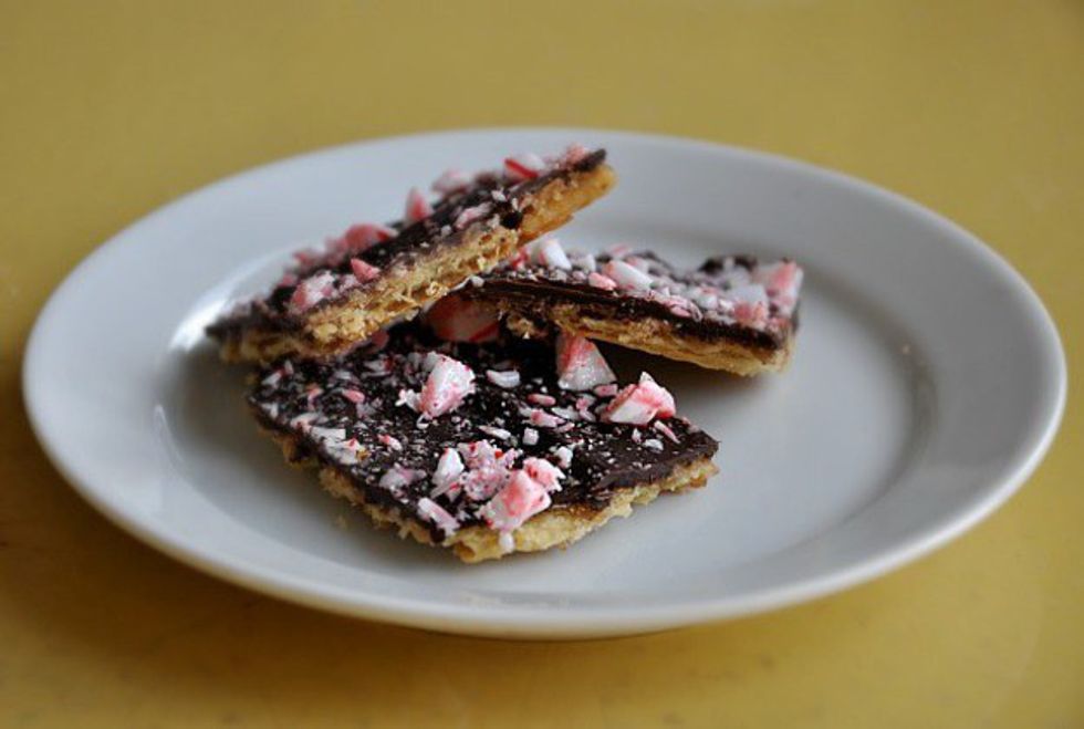 Preheat oven to 400 degrees. On a rectangular pan, lay out all the saltines you can flat next to each other. From there get out a small pot and bring both the brown sugar and butter to a light boil and until they both are completely dissolved. Let it sit on a very low heat without stirring it for about 3 minuets. After the 3 minuets are up, take it off the stove and gently pour over the saltines, covering them as best as you can. Once completely covered, put the covered saltines in the over for about 3-4 minuets or until nicely boiling (that means they are creating a hardening bottom layer for the toffee). Remove from oven when it begins to boil and briskly sprinkle a generous amount of chocolate chips on top of all the saltines. Insert them back into the over for about 2 minuets, while keeping a watchful eye, to make sure the chocolate chips don’t burn. After the 2 minuets remove the pan and give a nice dusting of the crushed candy canes over all the chocolate. Place in the fridge for about 20-30 minuets for it to harden and then they are all ready for Santa (and you) to indulge in!