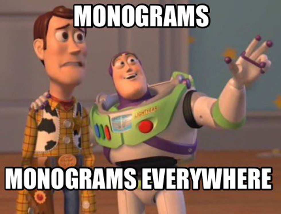 Seriously. Monogrammed. Everything. I can't go to a store, or go out in public, without seeing someone have an article of clothing, or a back, or a bumper sticker with their monogrammed initials. Usually, in that weird circular pattern, you know the one. What is with that? Do you not know your own initials? Do you want other people to know your initials? Please, just help me understand.