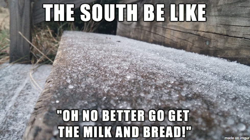 This goes for North Carolina in particular, not just the South in general. I get that the state is south of the Mason-Dixon line, and the states south of that line generally get less severe weather during winter. But seriously? Less than six inches of snow is not a cause for a state of emergency. The bread aisle at Walmart should no be completely cleaned out if you're only expecting to stay inside for a day or two. People in Florida handle hurricanes better than North Carolina handles snow storms.
