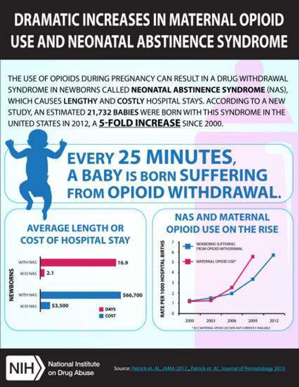 The person using the drug is not the only one affected. Pregnant women suffering from an opiate addiction can give birth to an opiate dependent baby. In 2012, every 25 minutes, there was a baby born with neonatal abstinence syndrome (a drug dependency). Since 2012, that number has quadrupled.