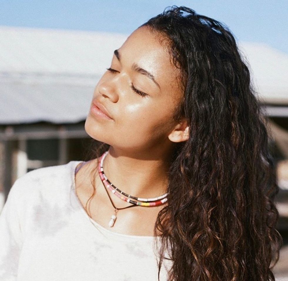 Layered necklaces, simple charms, and beaded pieces are staples in her closet. Here is a collection on Etsy where you can find natural, beachy chokers similar to the ones that Kiara is wearing here.