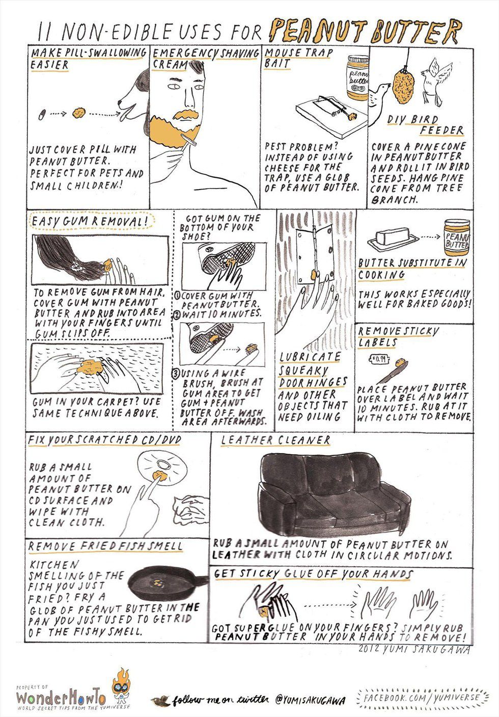Getting gum out of your hair or your shoe, sticker removal, and stopping hiccups. Scientists say that by concentrating on getting the peanut butter off of the roof of your mouth it should return your breathing to normal. I also read that peanut butter is a good leather conditioner. I've never tried this one simply because i like to savor my peanut butter for eating!