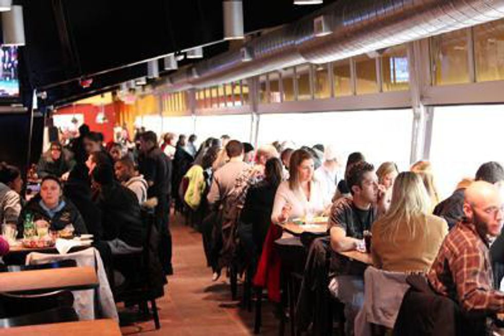 It's upstairs, overlooking the hockey rink in Arrington Arena. They have the best "fresh never frozen wings!"