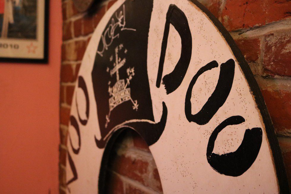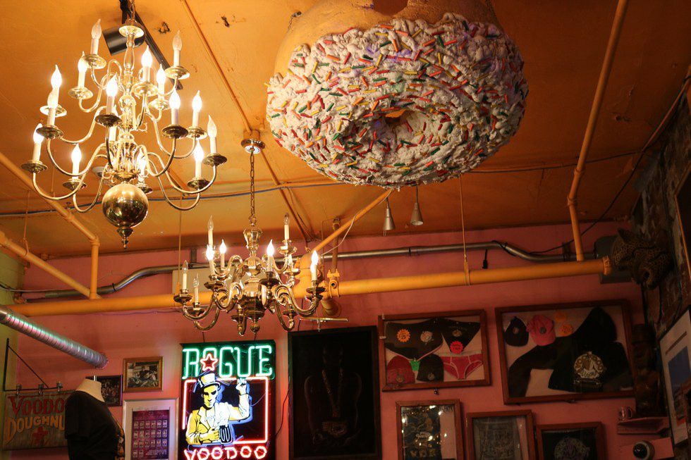 "Voodoo Doughnut" sign shaped as a doughnut hanging inside the doughnut shop.
