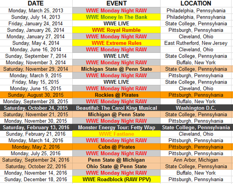 I was looking around on my Google Drive the other day, and came across a document that has all of the events I attended. Call it a virtual ticket keeper if you will. See, I like to document the places I've been and the seats I've sat in. Since 2013, I have spent over $1300 attending WWE, MLB, and NCAA events. I've been to 4 collegiate football games, 2 MLB games, over 15 WWE events, a concert, a Broadway play, theme parks, and numerous NCAA basketball games. I always hear people telling me that I am wasting money. Now often times I hear people ask me how I afford this. I am a full time student only working part time, and most of these events I have been at are 2+ hours away from the starting destination. I always say, "Where there is a will, there is a way." I have always found a way to attend that event that I want to attend, with the exception of WWE Wrestlemania because traveling 10+ hours is something that I do call unrealistic.