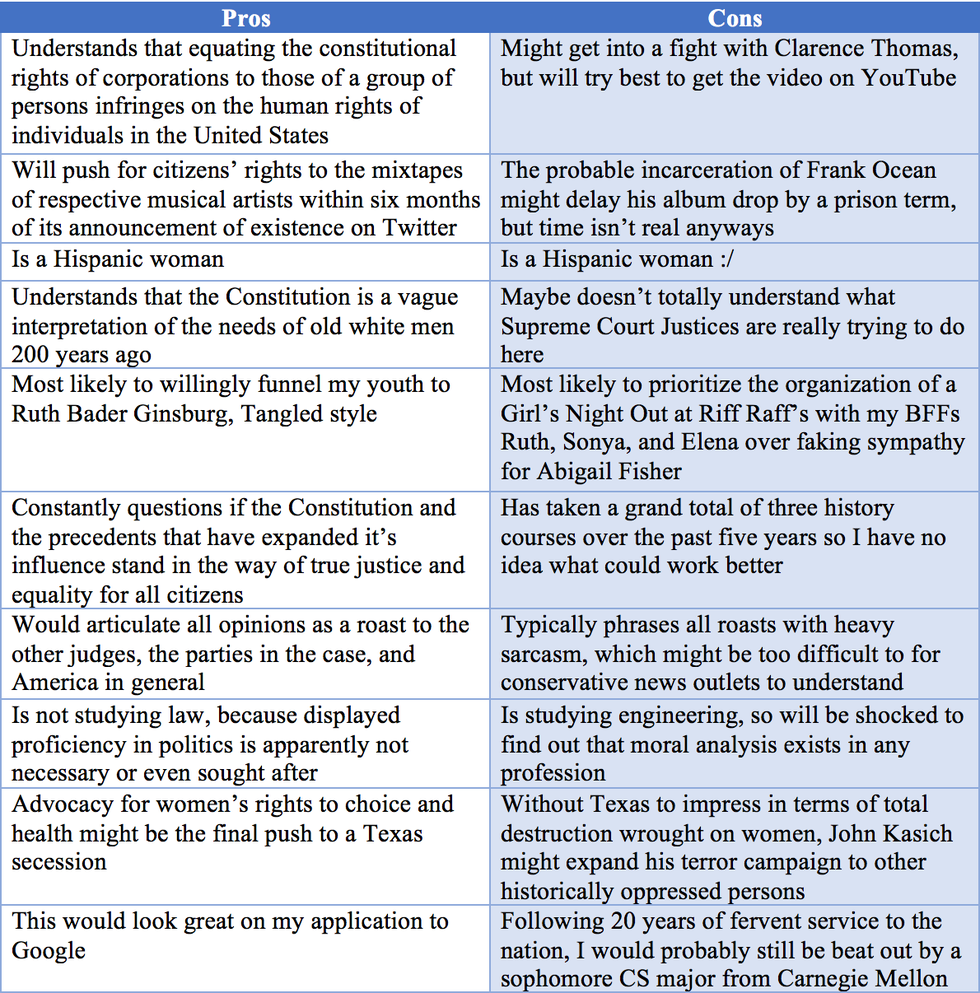 After having found out about the job opening as a Supreme Court Justice in its traditional declaration on Craigslist, I was absolutely ecstatic. The nation's highest court and its rulings play an integral role in the promotion of justice and fairness for the everyman. The magnanimity of the importance in the proper selection of the next justice, who will serve upwards of twenty years deciding exactly what we are and are not entitled to as citizens, cannot be emphasized enough. Given that I am a generally pretty OK person and I'm rumored to be intelligent, naturally I thought that I would be perfect for the job. In the spirit of transparency, I've actually constructed a pros and cons list of what would happen if I became a Supreme Court Justice. Take a look.