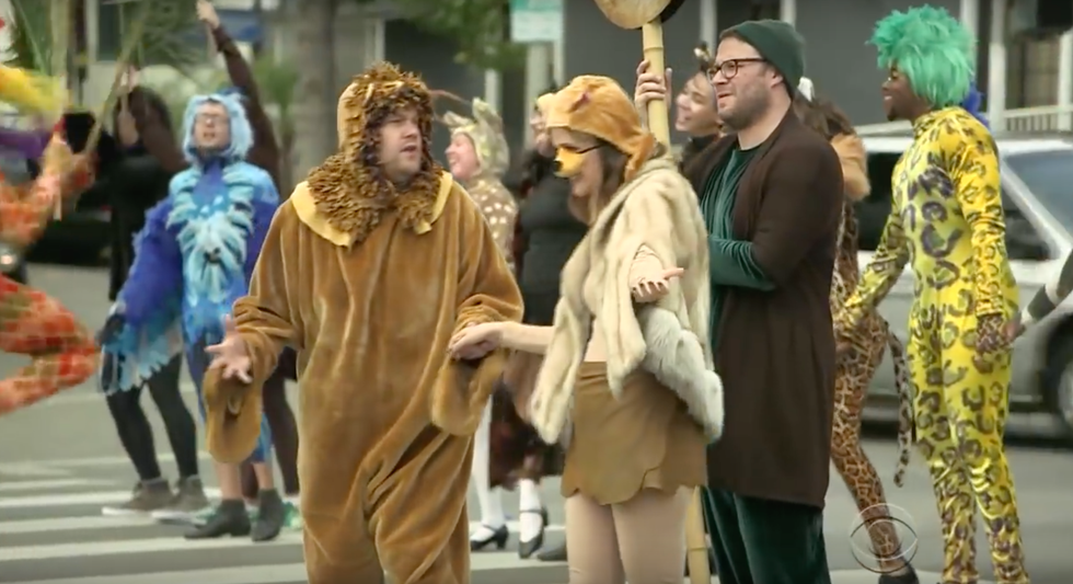 Seth Rogen and Rose Byrne guest star in this crosswalk creation. Corden once again plays the main character of the show, leaving Rose Byrne to portray both Nala and Timon, while Seth Rogen is used as scenery.