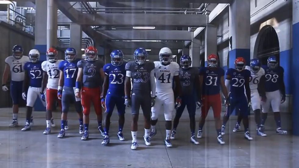 The Jayhawks combine red ,white, grey, and blue to have many different looks for gameday and to sway recruits to the rock chalk nation