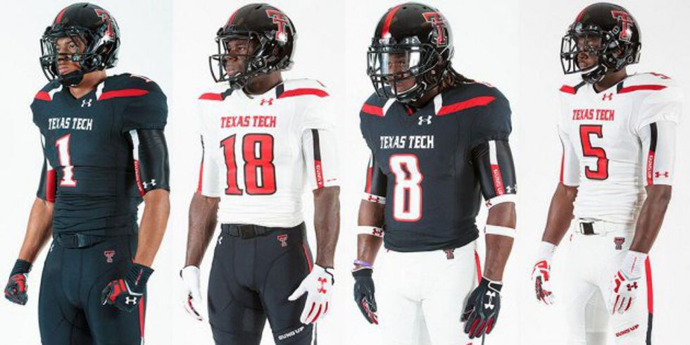 The red raiders uniforms have the red white and black color scheme. They do a good job of mixing the combinations up while also adding special Texas pride helmets.