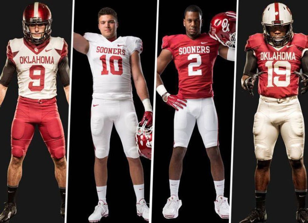 Oklahoma has two different sets of uniforms. the first set is the regular home and away set and the new bringing the wood set. Both sets do a good job of really showing off the school's crimson and cream color code.
