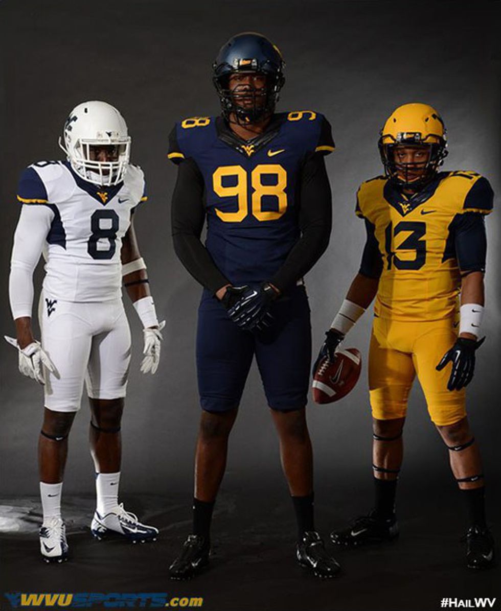 The mountaineers revealed these new jerseys in 2013. Bringing in a new more stylish look to Morgantown the new uniform set comes with 3 helmets, jerseys, and pants, giving the mountaineers 27 new options for gameday