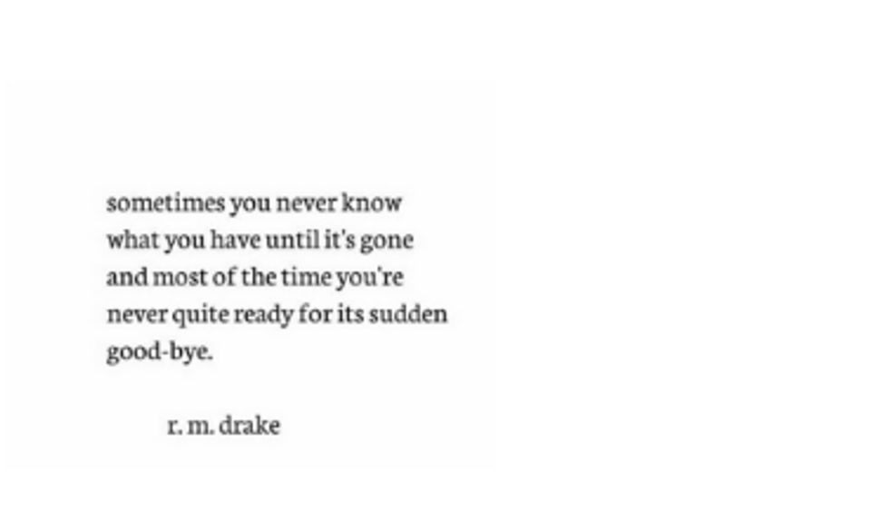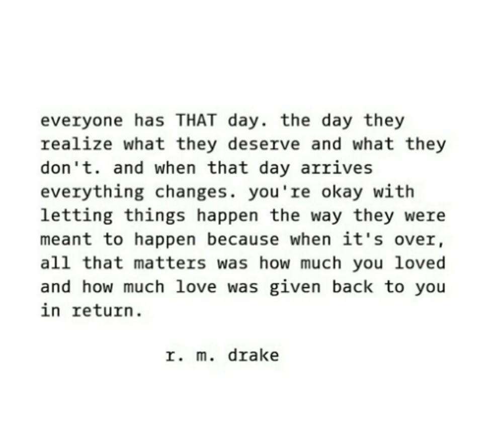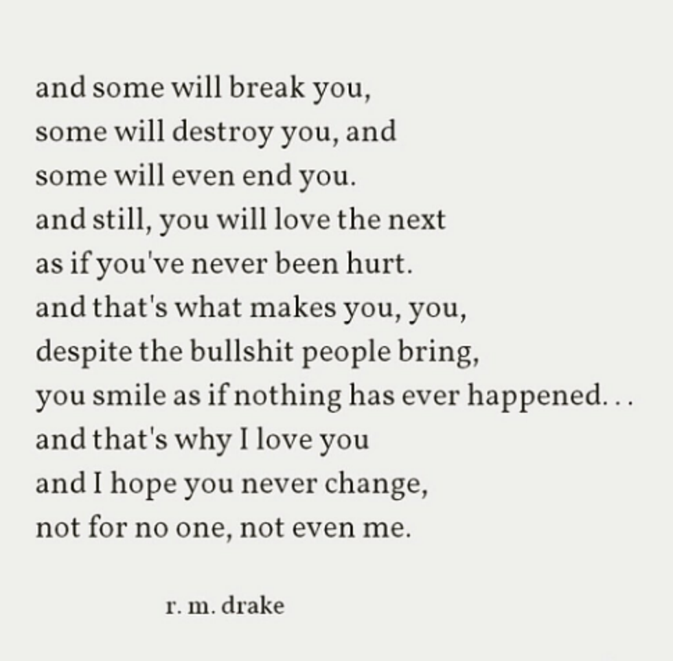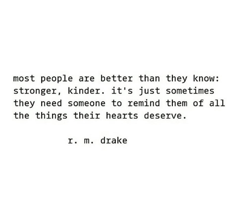 Who in the world is RM Drake? I stumbled upon his Instagram one day while scrolling through my feed. As I ran through his page, I realized how raw his writing was. These little excerpts, perfectly written to depict the true emotions of a human being, spoke about my life effortlessly. There seemed to be something relevant posted on his feed daily, words that I struggled to formulate myself about the life I was living. RM Drake became famous through Instagram, posting these little bits from his books in the typical typewriter font. The incredible thing to me, is that these quotes are read across the world, and to each unique situation, people resonate with them. That is what writing is, that's what writing does, and that's how you should feel when you read a piece of incredible work. Here are some of my favorites: