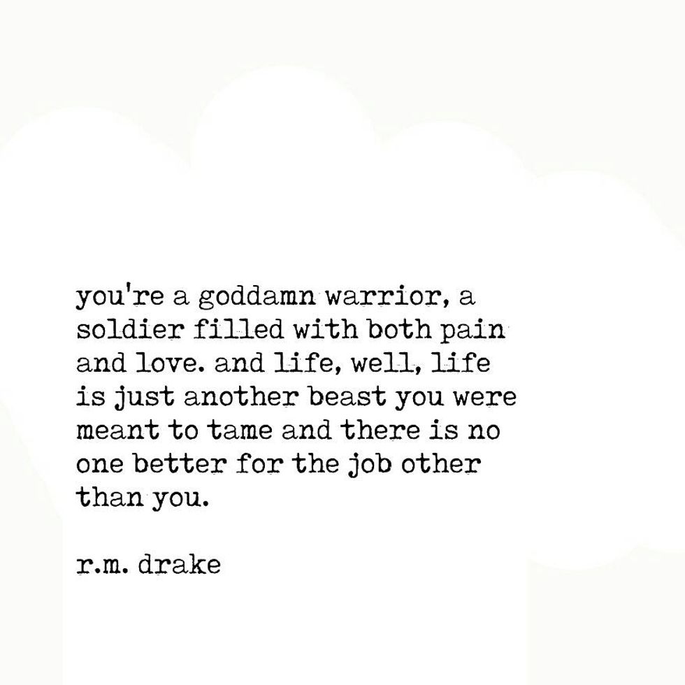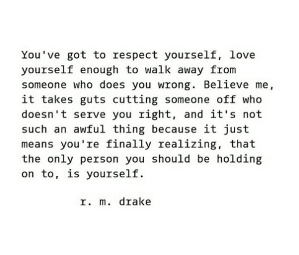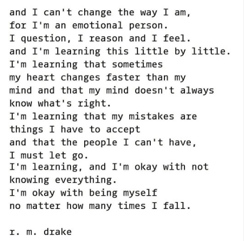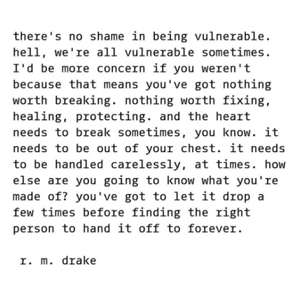 Who in the world is RM Drake? I stumbled upon his Instagram one day while scrolling through my feed. As I ran through his page, I realized how raw his writing was. These little excerpts, perfectly written to depict the true emotions of a human being, spoke about my life effortlessly. There seemed to be something relevant posted on his feed daily, words that I struggled to formulate myself about the life I was living. RM Drake became famous through Instagram, posting these little bits from his books in the typical typewriter font. The incredible thing to me, is that these quotes are read across the world, and to each unique situation, people resonate with them. That is what writing is, that's what writing does, and that's how you should feel when you read a piece of incredible work. Here are some of my favorites: