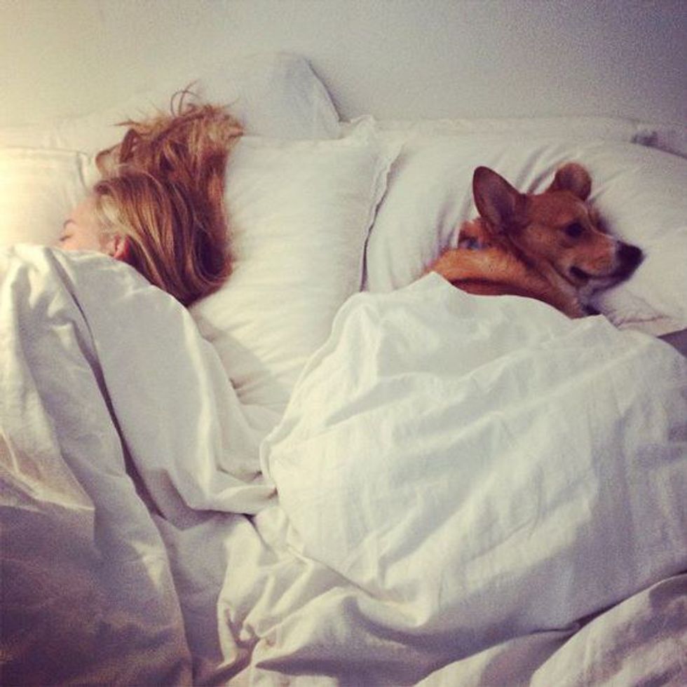 There is nowhere else the dogs are allowed to sleep other than in her bed, so she's used to sharing it. She'll make room for you, but don't expect her to take the dog out of her bed.